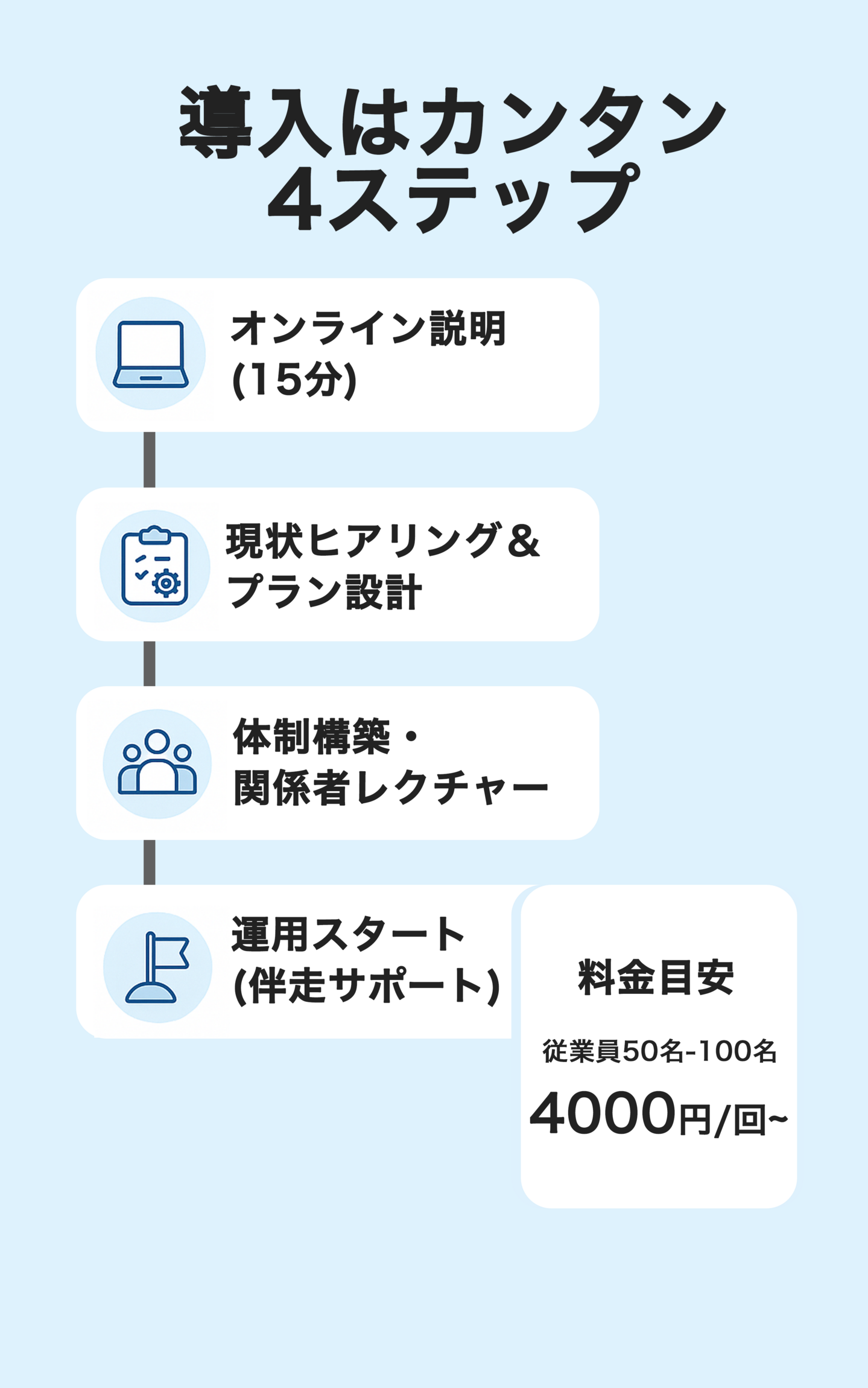 A. 50〜1,000名規模で多数実績。業態別にプランを最適化します。